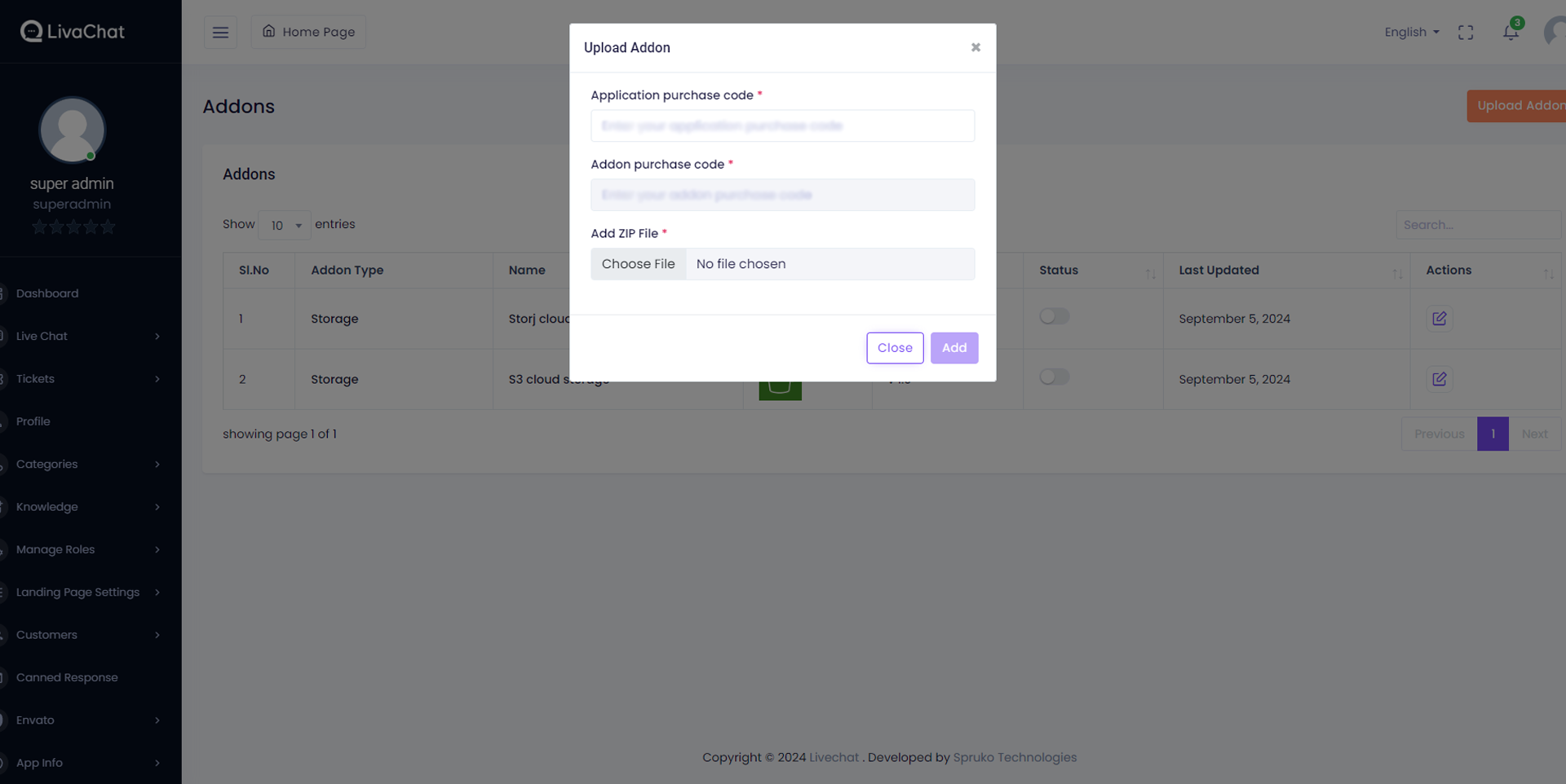 step:2 Click on the "Upload Addon" button, a popup will appear with the required fields. Fill in the requested details, then click the 'Add' button to add your addon to the list of addons.