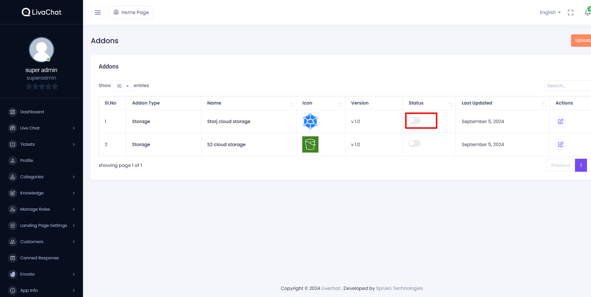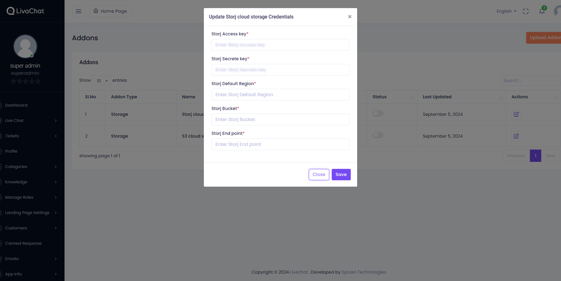 Ensure that you have activated the status of the S3 option. Remember, only one storage addon can be active at a time. Enabling the S3 storage addon will automatically disable all other storage addons. Keep in mind that all your files will now be stored in the S3 storage from this point onward.