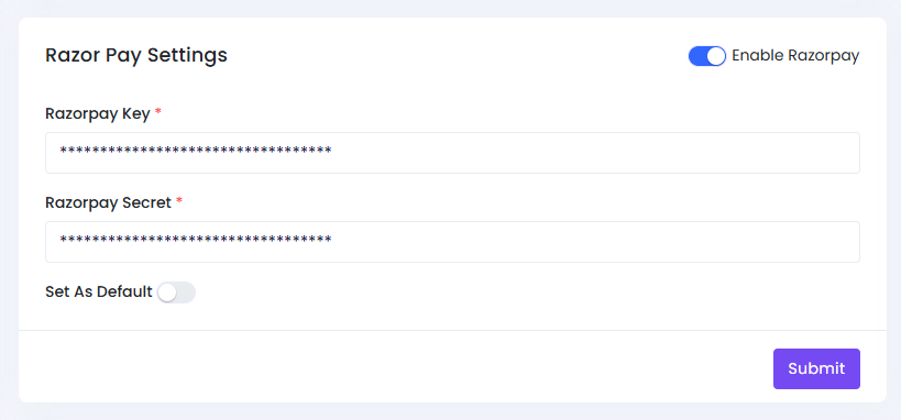 To generate Razorpay API keys (publishable and secret) for your application, follow these steps: