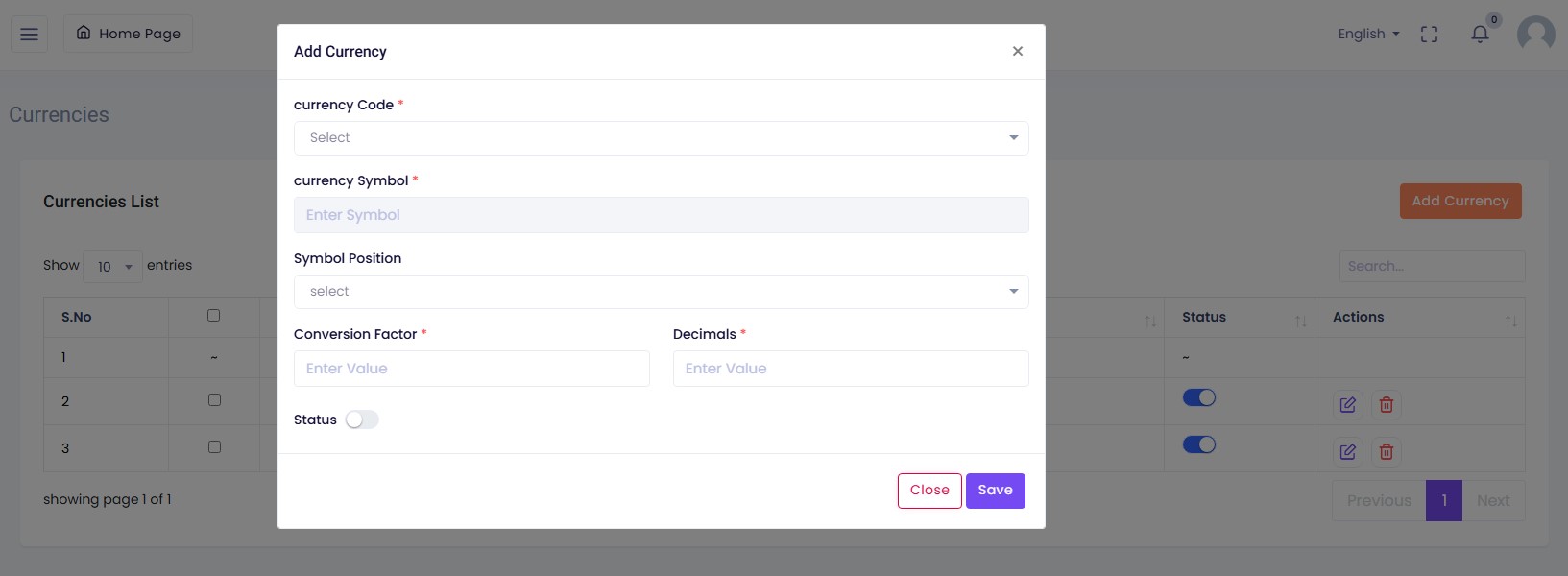 The Currencies List page displays all the currencies configured in the system. These currencies are used to define pricing for subscription plans and addons. Admins can add, update, or manage currencies based on supported regions or business needs.