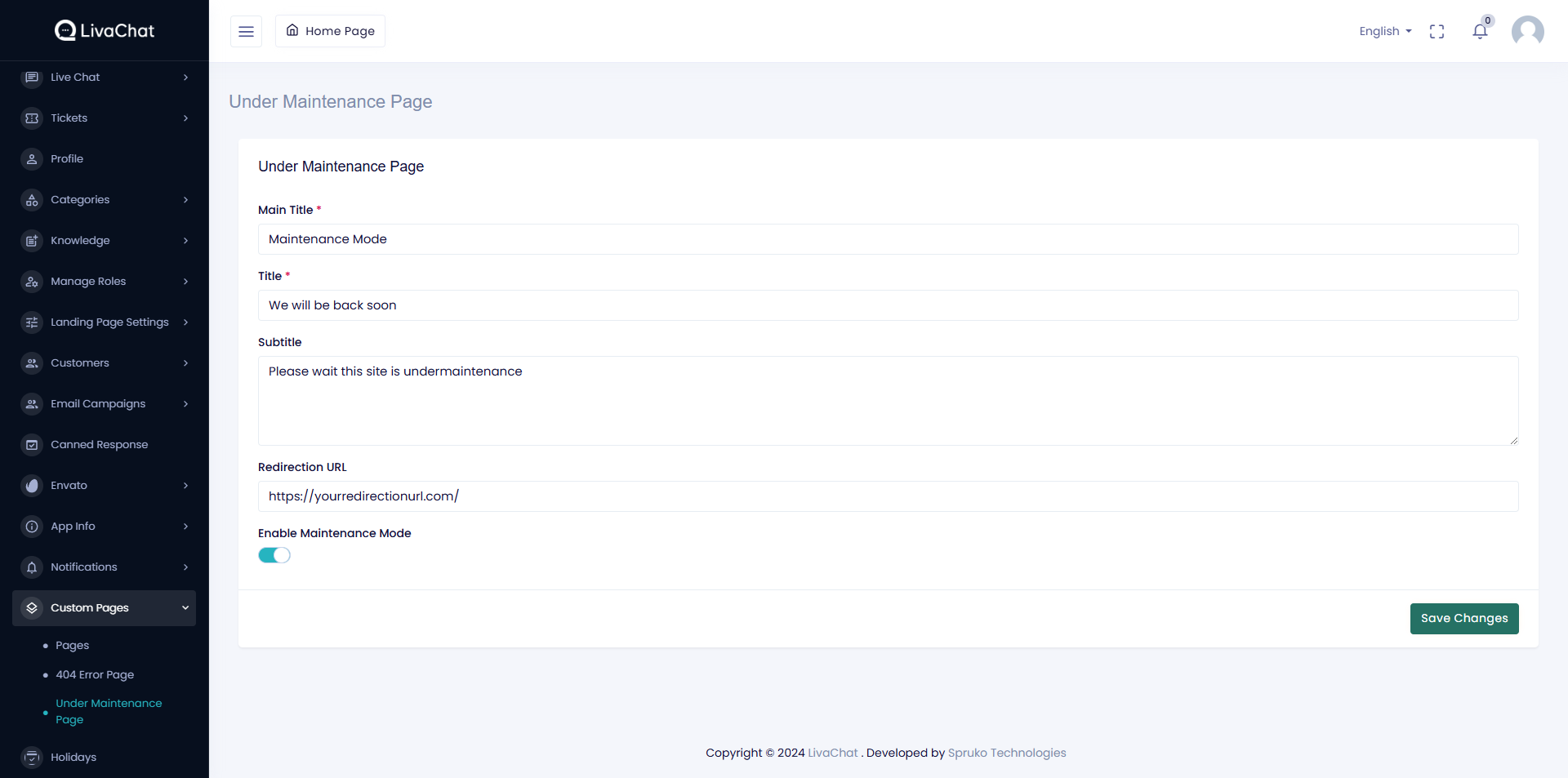 - If a **Redirection URL** is provided, the application will redirect all customers to the specified URL. This will not affect any admin panel users. If left empty, the default application's maintenance page will be displayed to customers.