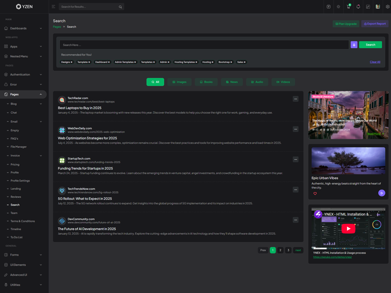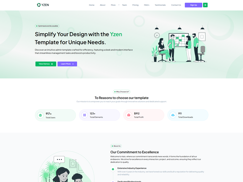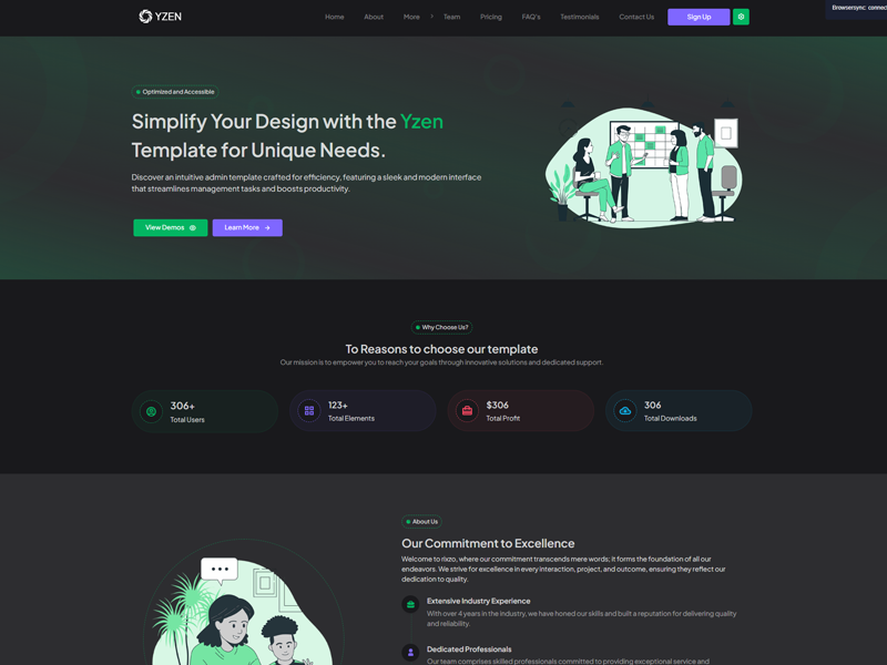 Yzen has important features such as the design quality, reusable components, responsiveness, ease of customization, documentation and support, and additional features such as plugins also integrated.